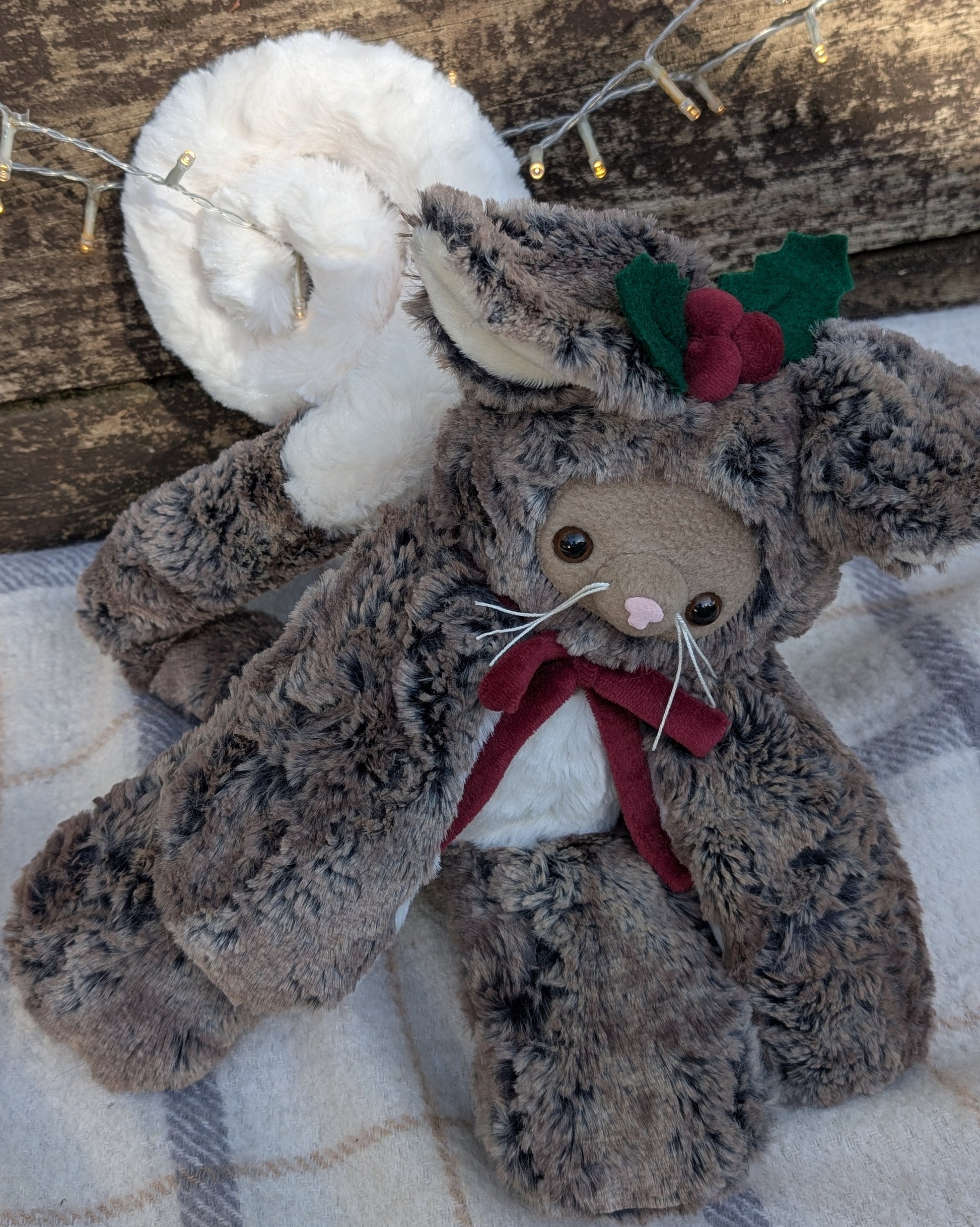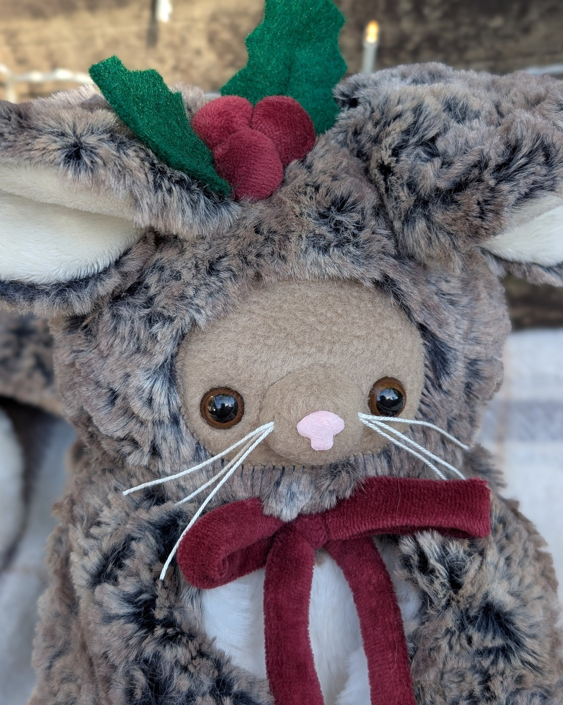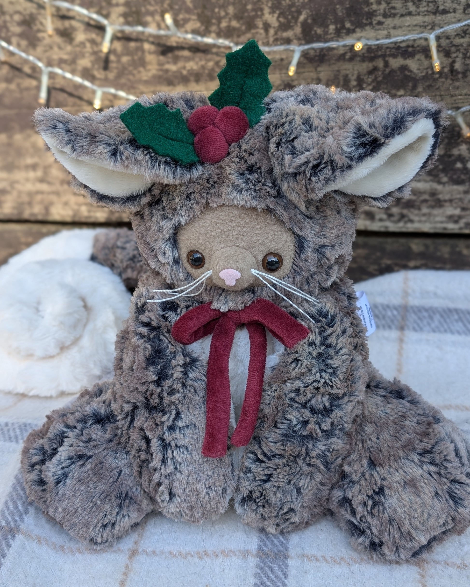 ✂️ Materials- Plush faux fur, minky, fleece and felt. Has plastic safety eyes. Filled with poly fill and a mix of poly pellets in limbs.