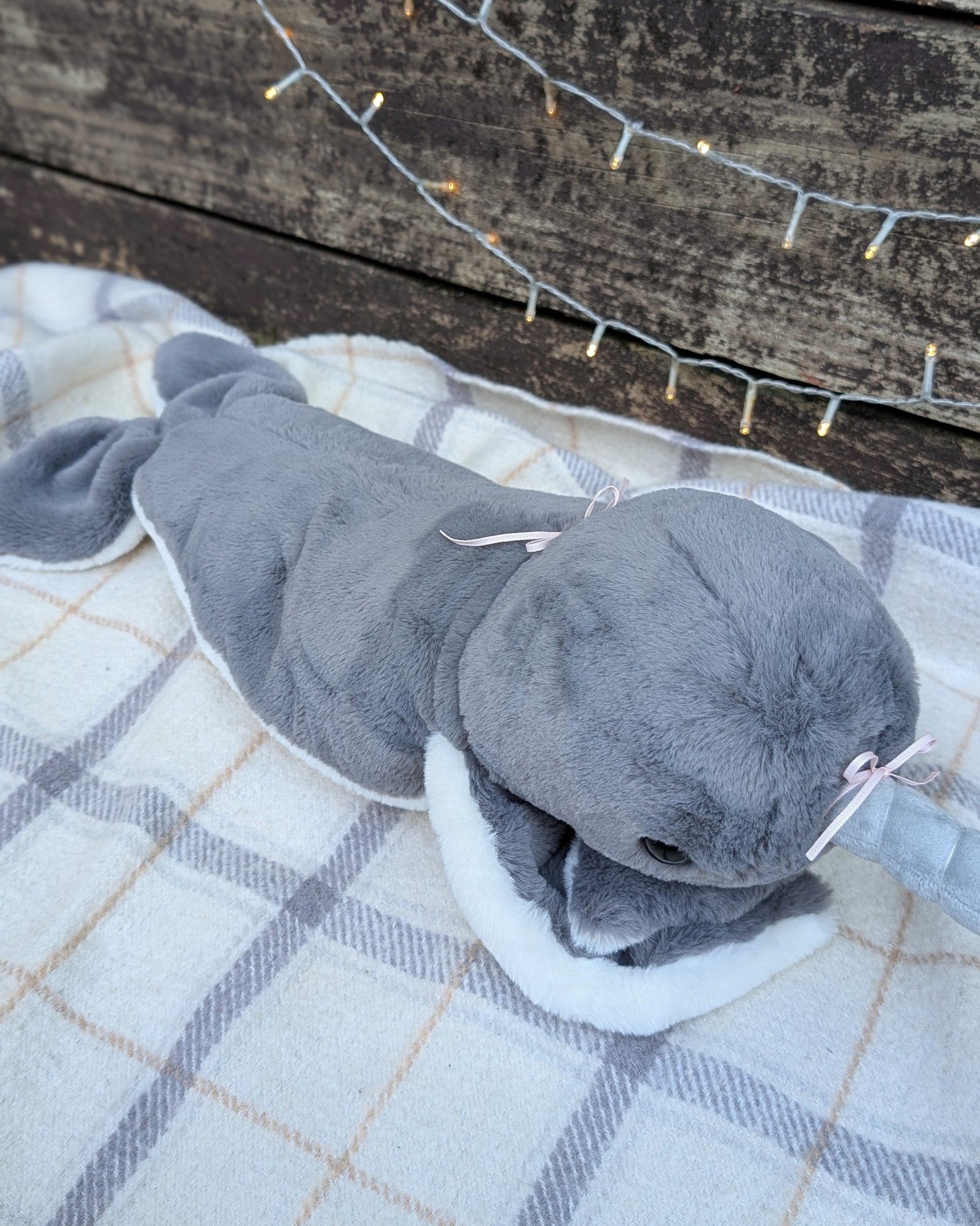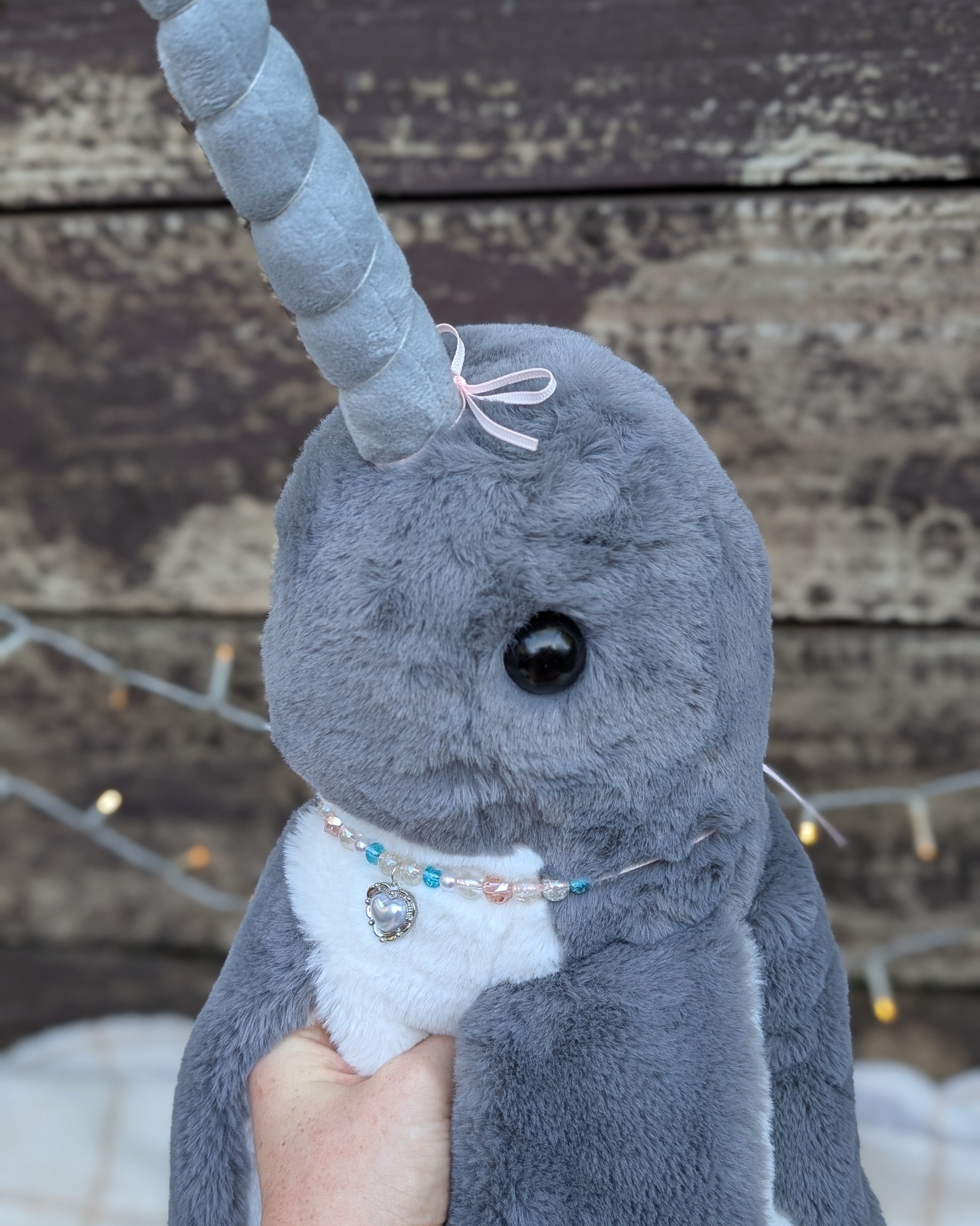 ✂️ Materials- Plush faux fur, minky, ribbon, beads and charm. Has plastic safety eyes. Filled with poly fill and a mix of poly pellets in tail and fins.