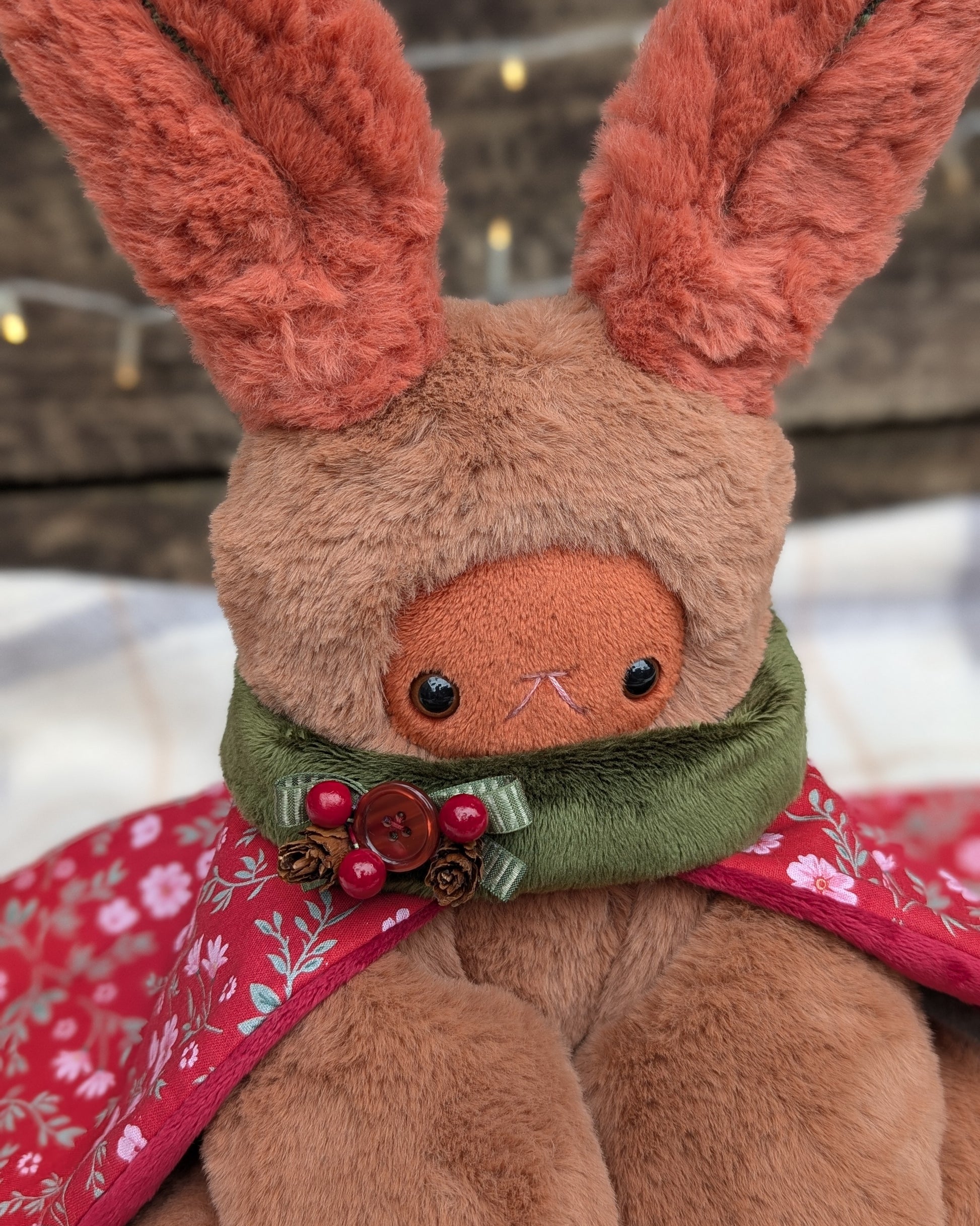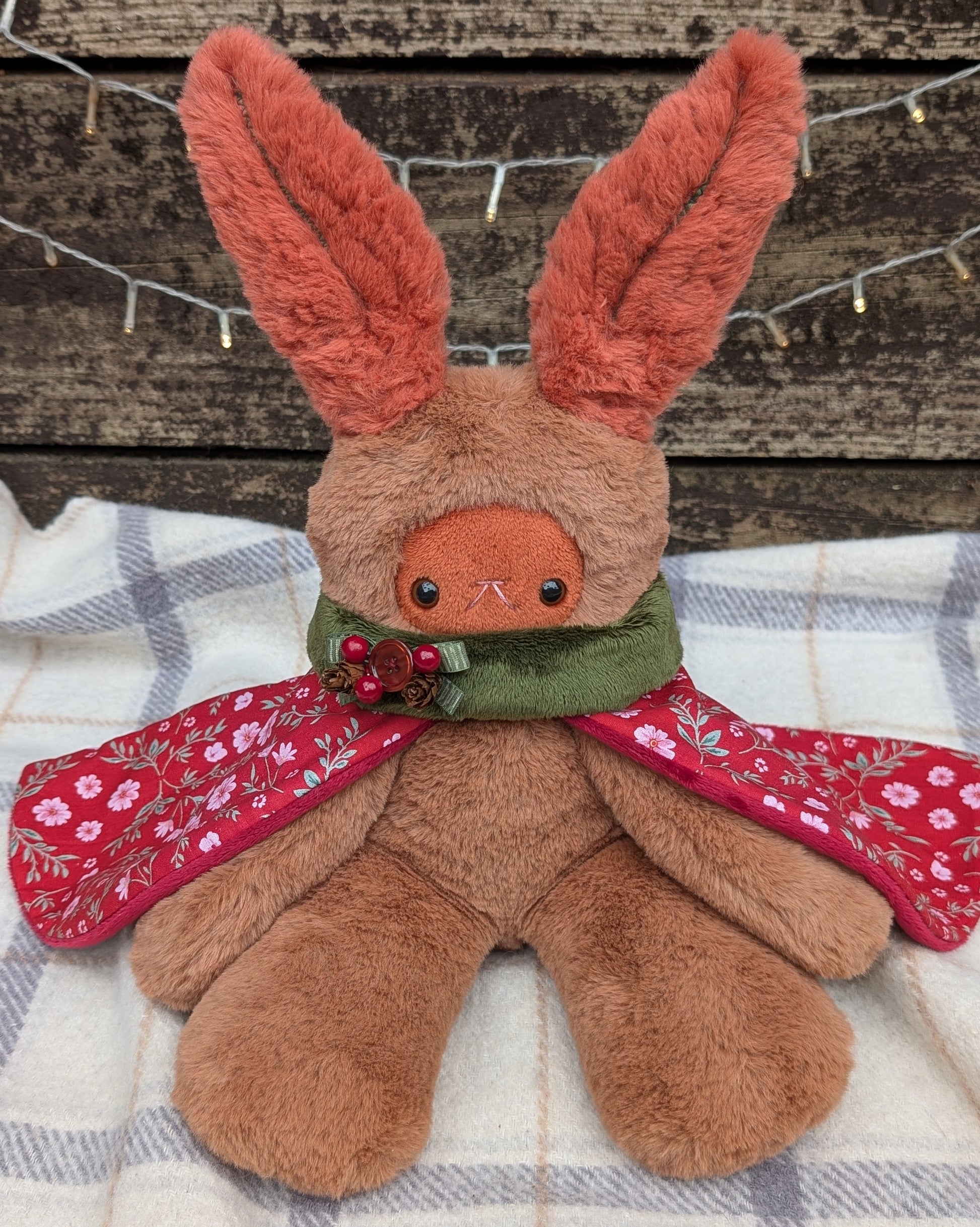 ✂️ Materials- Plush faux fur, minky, cotton fabric and a handmade ornament. Has plastic safety eyes. Filled with poly fill and a mix of poly pellets in limbs.
